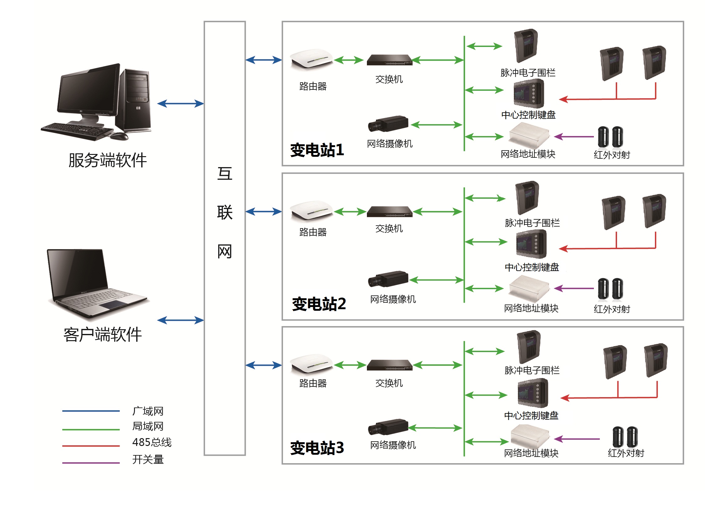 常規(guī)高壓變電站:35KV、110KV、220KV、500KV。采用RS485總線,將脈沖圍欄主機接入中心控制鍵盤,在通過網(wǎng)絡(luò)單機控制軟件SW3500進(jìn)行管理。