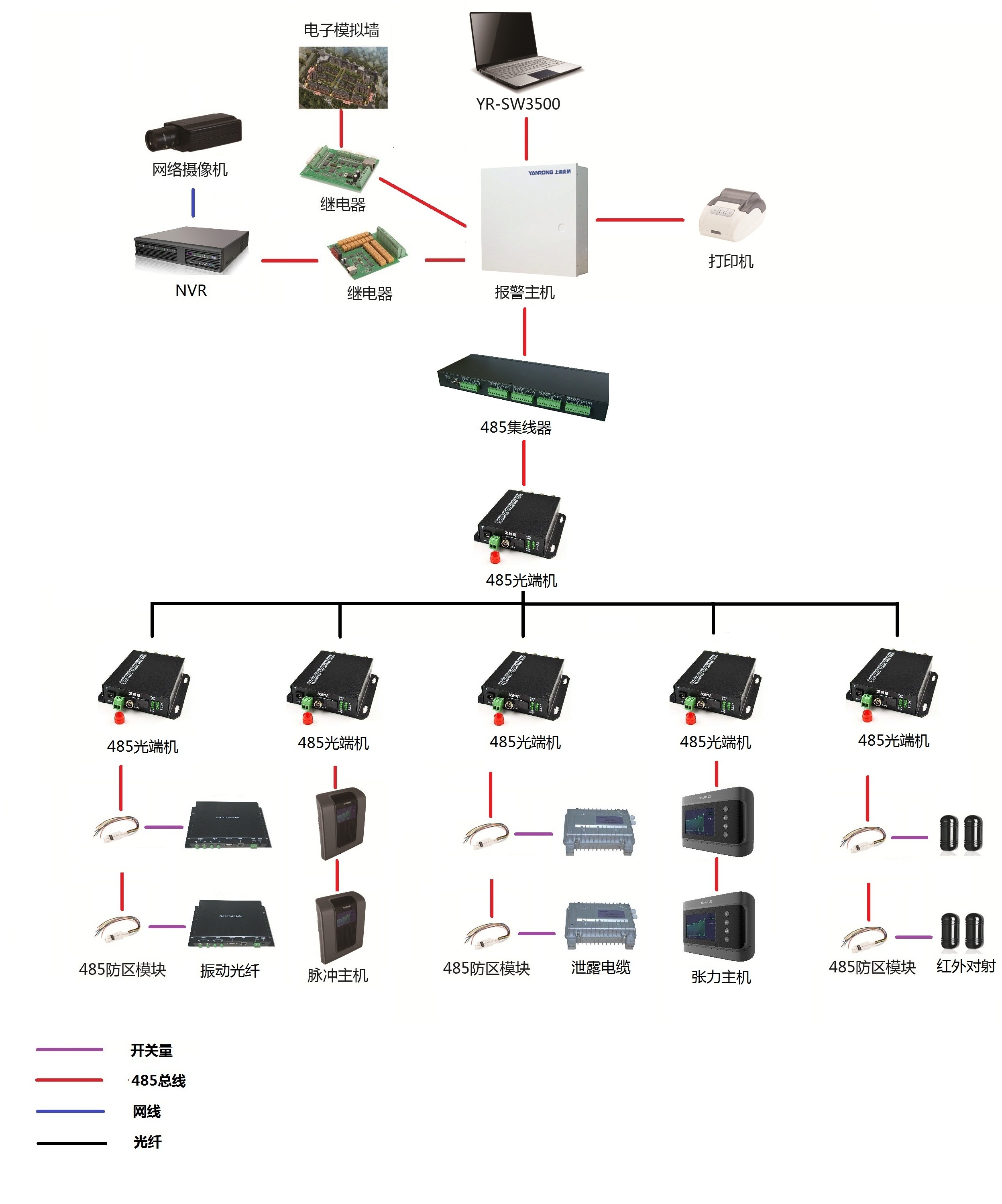 周界每0.6~1公里放置一臺(tái)485光端機(jī),這0.6~1公里區(qū)域內(nèi)的前端設(shè)備(脈沖圍欄主機(jī)/張力圍欄主機(jī)/泄露電纜主機(jī)/振動(dòng)光纖主機(jī)),通過RS485總線的方式接入到485光端機(jī)上。485光端機(jī)通過光纖匯聚到中心控制室,接入報(bào)警主機(jī),并通過網(wǎng)絡(luò)單機(jī)控制軟件SW3500進(jìn)行集中管理。