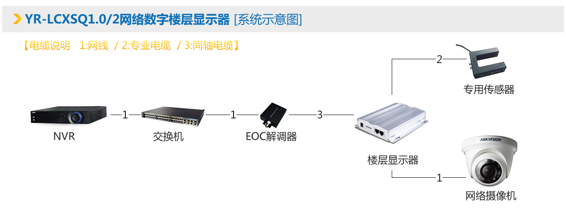 電梯隨行電纜傳輸距離超過(guò)75米或使用同軸線,應(yīng)選用YR-LCXSQ-1.0/2型號(hào)樓層顯示器,電梯網(wǎng)絡(luò)半球攝像機(jī)通過(guò)網(wǎng)線接入樓層顯示器,樓層顯示器內(nèi)置EOC編碼器,由樓層顯示器的同軸接口,通過(guò)同軸電纜進(jìn)入后端的EOC解調(diào)器,后端EOC解調(diào)器再轉(zhuǎn)出網(wǎng)絡(luò)信號(hào)接入后端交換機(jī)進(jìn)入NVR。